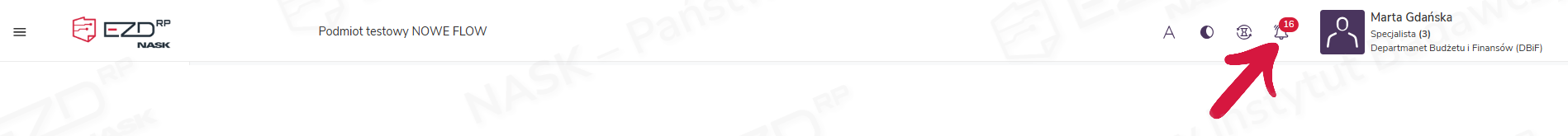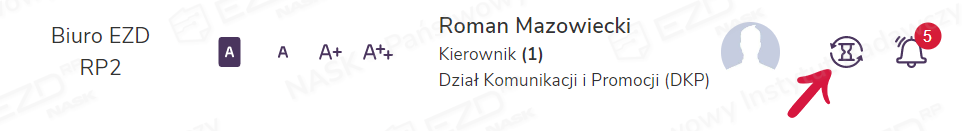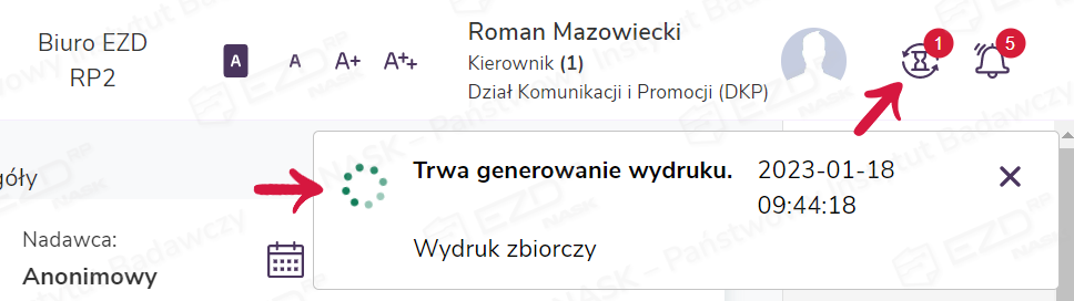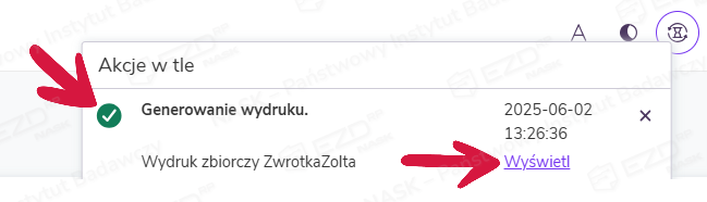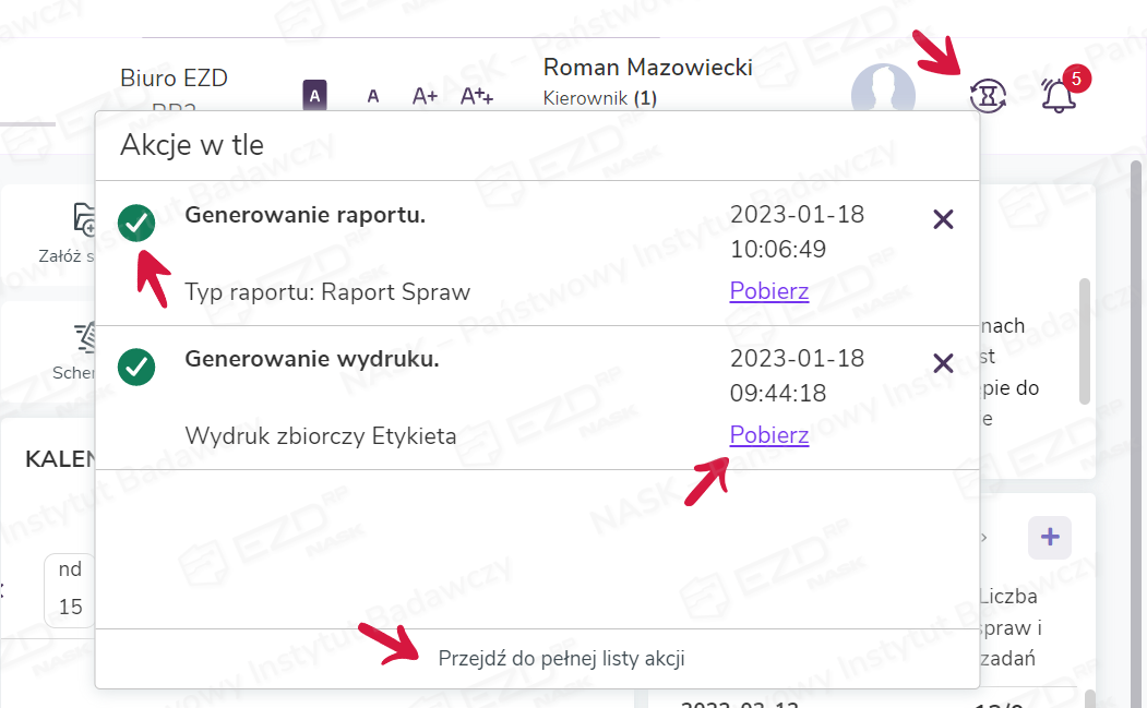 Aby uzyskać informacje o statusie akcji w tle, należy kliknąć ikonę klepsydry, która znajduje się w menu górnym, obok ikony dzwonka (powiadomienia systemowe).