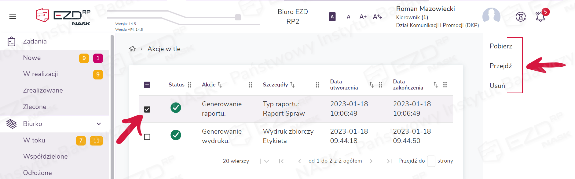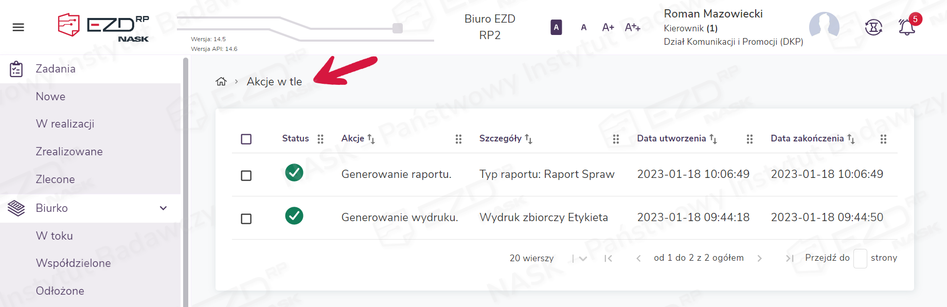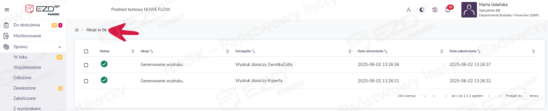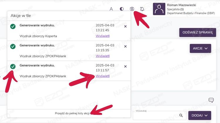 Podczas pracy w EZD RP niektóre czynności nie są wykonywane przez system od razu, lecz przekazywane do kolejki i realizowane sukcesywnie w trakcie naszej pracy jako Akcje w tle. Są to czynności, których wykonanie obciąża system w większym stopniu niż standardowe zadania, np. generowanie wydruków kopert, etykiet, zwrotek, wkładek adresowych (przy większej liczbie adresatów niż jeden) lub raportów.