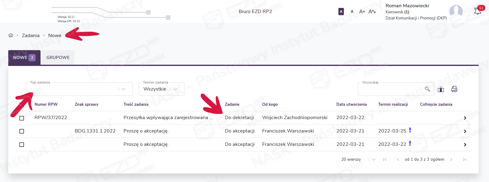 W systemie EZD RP pismo zewnętrzne, które wpłynie do kancelarii jest rejestrowane, a następnie przekazywane w postaci przesyłki wpływającej zarejestrowanej. Jeżeli chcemy, aby pismo trafiło do konkretnego pracownika, musimy zadekretować do niego przesyłkę. W sekcji Zadania > Nowe oraz Zadania > W realizacji użytkownik ma możliwość podglądu i filtrowania przypisanych do niego zadań. Dla zadań typu Do dekretacji lub Do realizacji jest wyświetlana lista pism podlegających dekretacji.