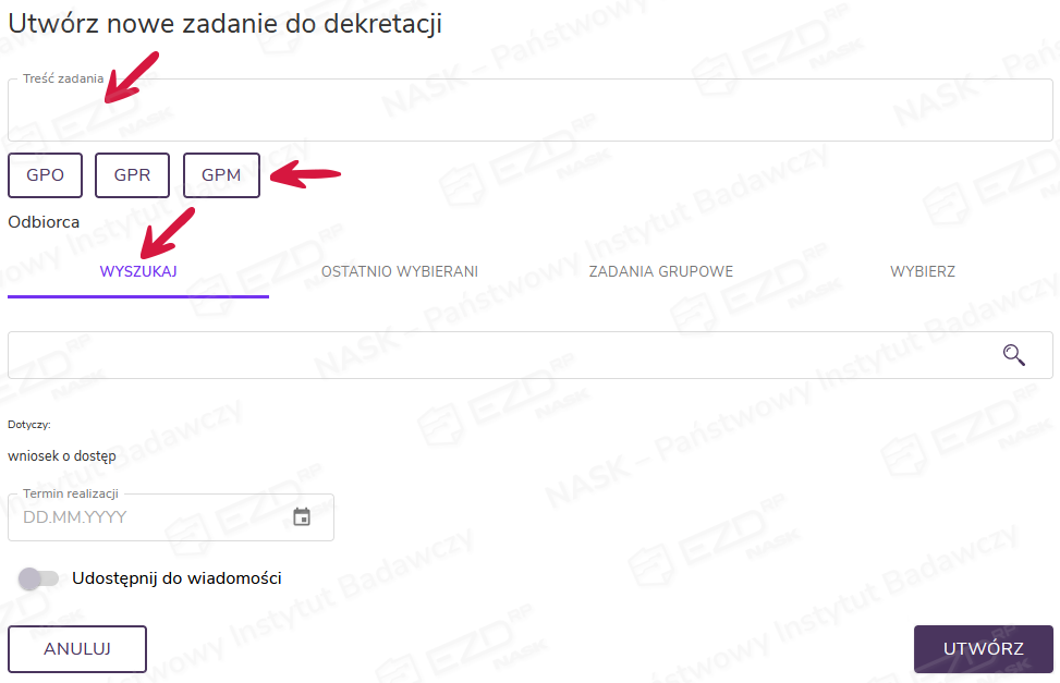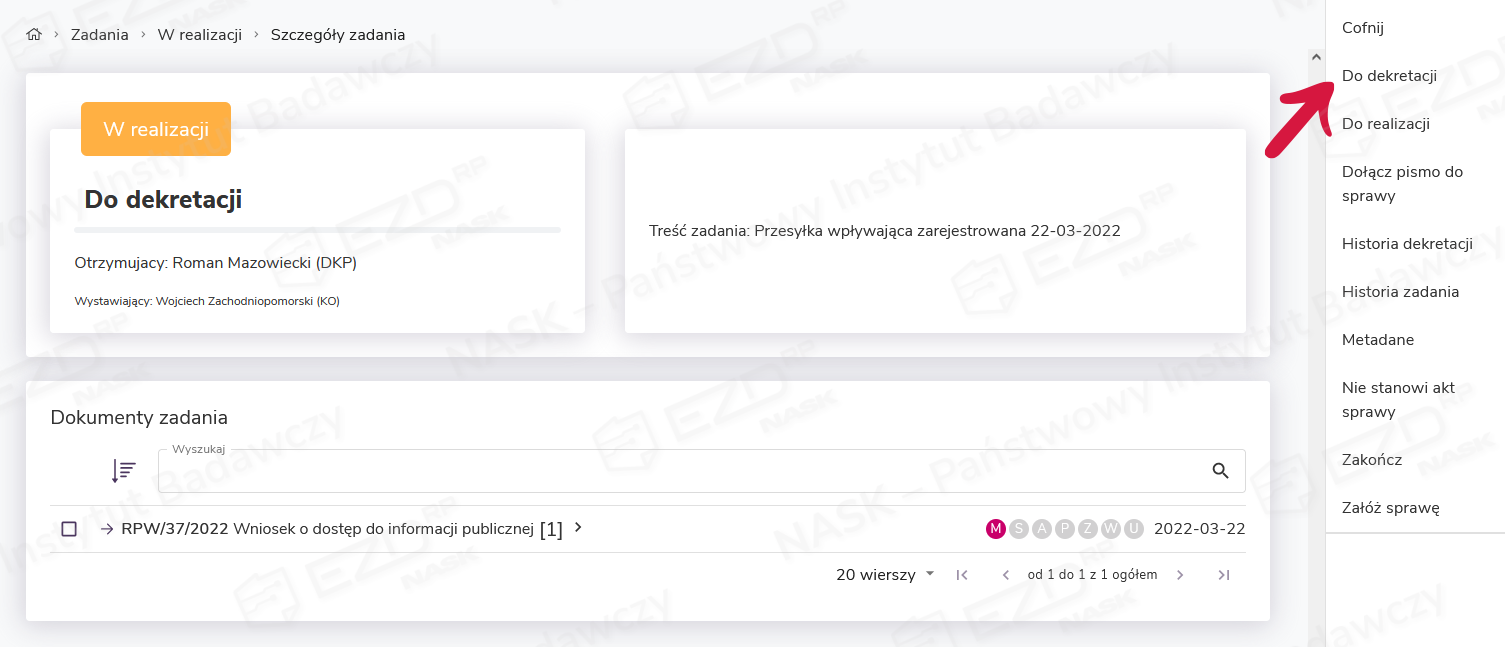 Po przejściu do widoku szczegółów zadania nalezy z prawego menu wybierać typ zadania, w tym przypadku Do dekretacji.