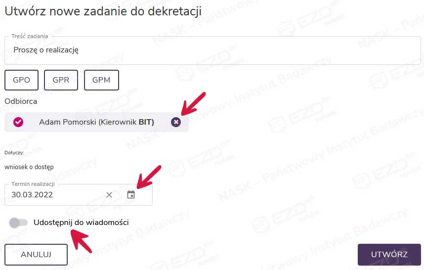 W oknie dostępne są jeszcze dwa elementy: Dotyczy i Udostępnij do wiadomości. W polu Dotyczy system automatycznie wstawia nazwę pisma, które chcemy zadekretować.