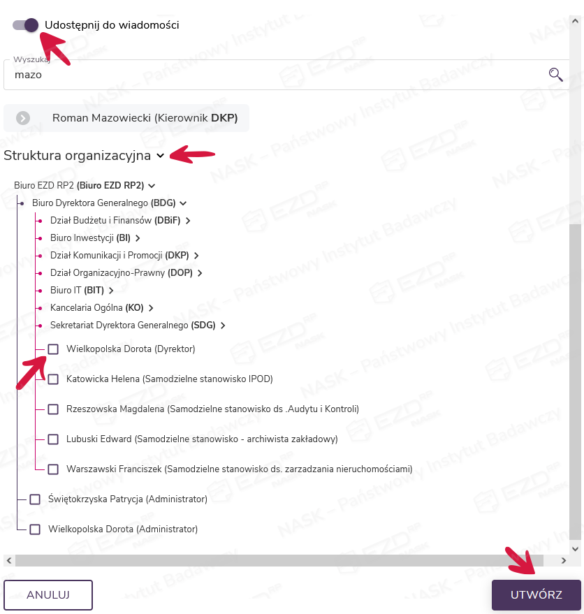 Pole Udostępnij do wiadomości pozwala jednocześnie udostępnić dekretowany dokument do wiadomości innym osobom. Użytkownik może wybrać odbiorców, wprowadzając ich imiona lub nazwiska w polu Wyszukaj lub wybrać osoby ze struktury organizacyjnej instytucji. Przy udostępnianiu do wiadomości można wskazać nie więcej niż dwudziestu pracowników (jest to domyślna wartość, która może zostać zmieniona przez Administratora).