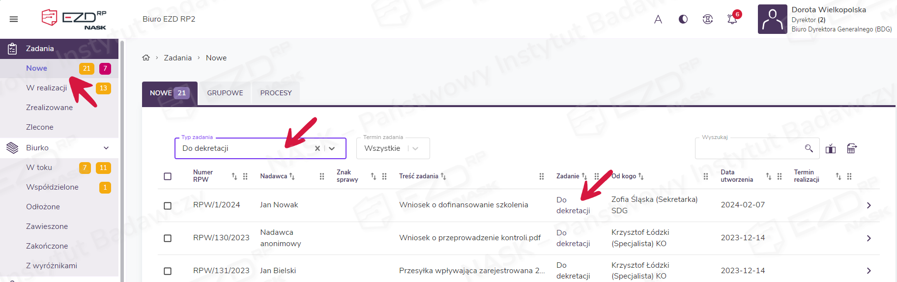 Pracownik, do którego pismo zostało zadekretowane, odnajdzie zadanie na swoim koncie w sekcji Zadania > Nowe.