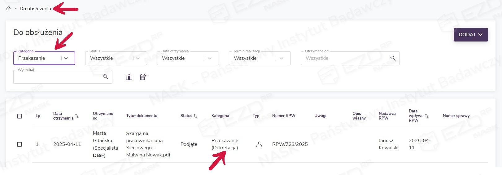 Pracownik, do którego pismo zostało zadekretowane, odnajdzie je w sekcji Do obsłużenia, również z kategorią Przekazanie (Dekretacja).