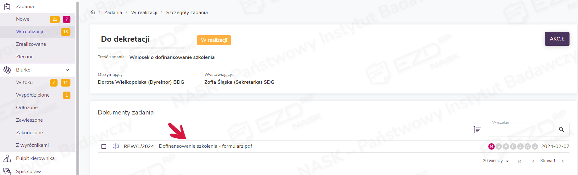Kliknięcie wiersza z konkretnym zadaniem przeniesie użytkownika do jego szczegółów. W tym miejscu może zapoznać się z treścią pisma, które zostało mu przekazane (jeśli dokument zeskanowano i włączono do systemu). Wyświetlenie podglądu dokumentu następuje po kliknięciu jego tytułu.