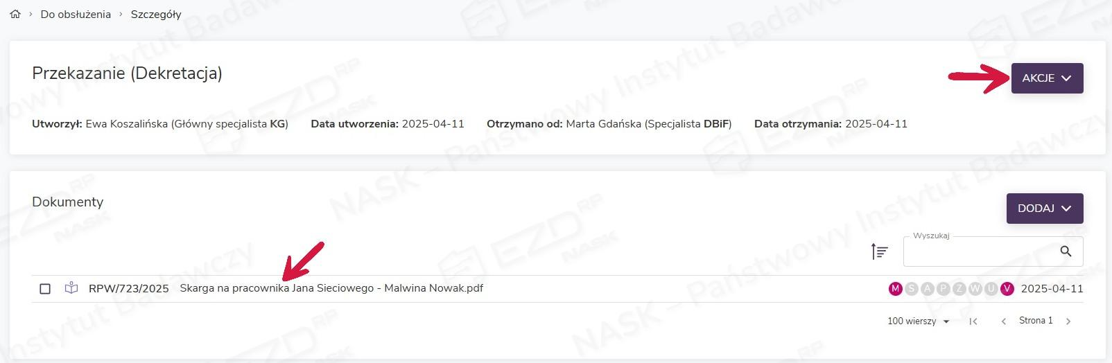 Czynności, które można wykonać z otrzymanym zadaniem Do dekretacji, znajdują się pod przyciskiem Akcje.