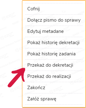 Wśród dostępnych opcji znajdują się dwie, które pozwalają przekazać pismo na konto innego pracownika – Przekaż do dekretacji oraz Przekaż do realizacji. Tę drugą opcję można wykorzystać, żeby wskazać ostatecznego pracownika, który powinien zająć się przekazywanym pismem (np. założyć sprawę, w ramach której będzie dalej je procedował). Zadanie Do dekretacji natomiast pozwala przekazać pismo innej osobie (np. kierownikowi komórki organizacyjnej), która następnie wskaże prowadzącego sprawę.