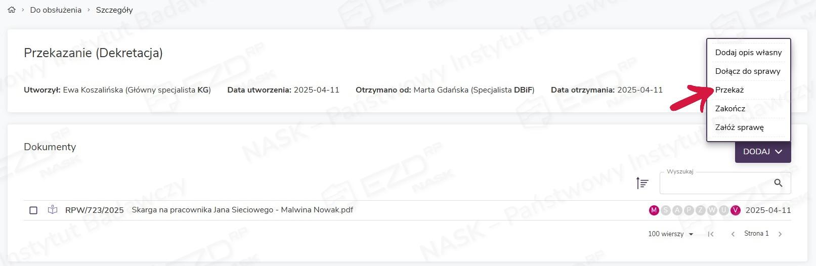 Po wejściu w szczegóły należy wybrać przycisk Akcje, a w rozwiniętym menu kliknąć Przekaż.