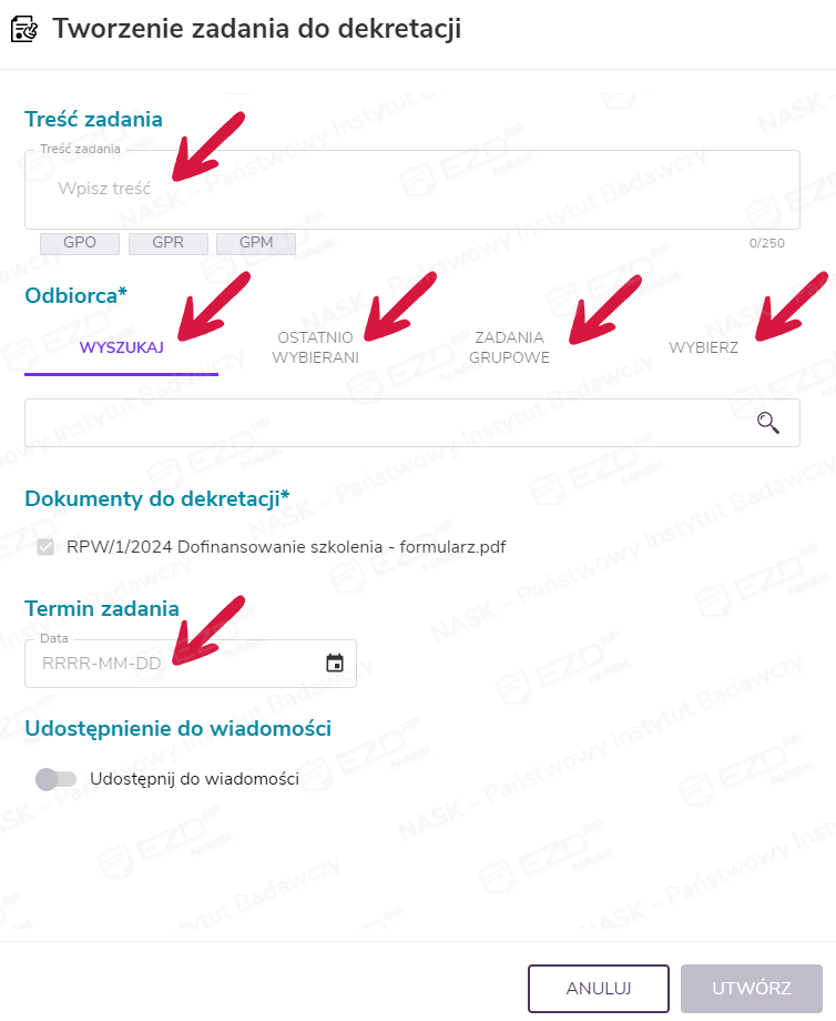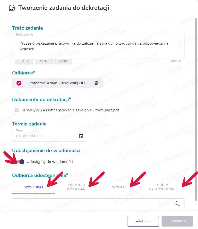 W oknie tworzenia zadania Do dekretacji dostępna jest jeszcze możliwość udostępnienia do wiadomości. Warto skorzystać z tej opcji, żeby poinformować wybranych pracowników o fakcie wpłynięcia do instytucji pisma i dać im możliwość zapoznania się z jego treścią. Aby wskazać pracowników, należy przesunąć (aktywować) suwak.