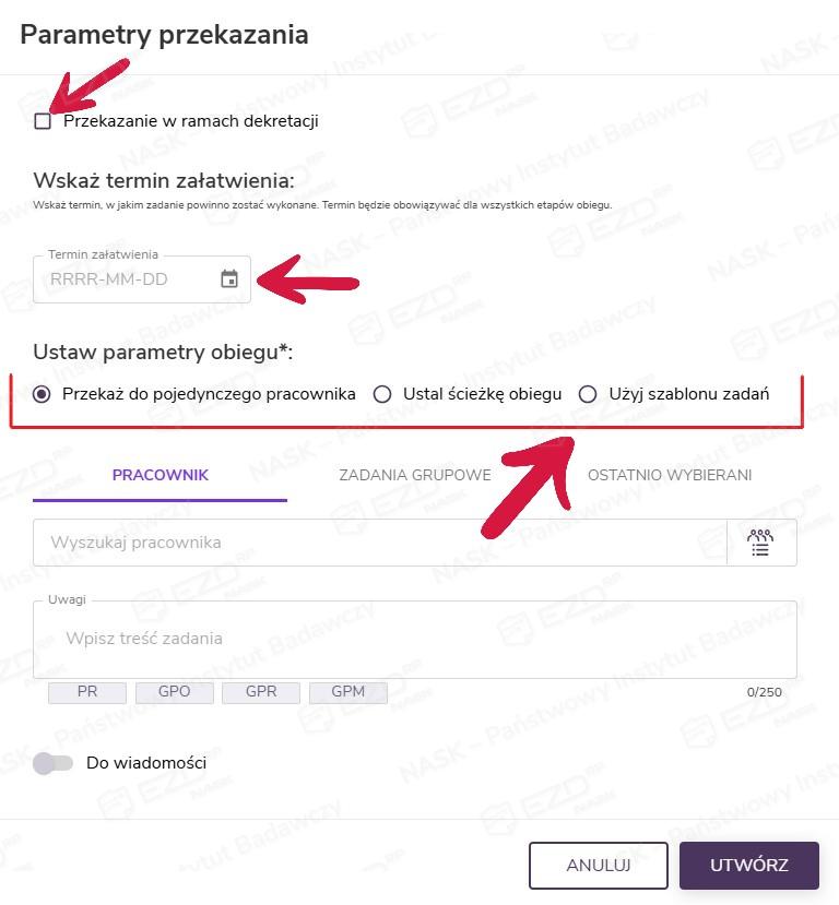 Na ekranie zostanie wyświetlone okno Parametry przekazania. Należy zaznaczyć w nim pole wyboru Przekazanie w ramach dekretacji, które umożliwi oznaczenie danego przekazania jako dekretacja. Następnie można wskazać termin załatwienia. Uzupełnienie tego pola nie jest obowiązkowe, ale umożliwia określenie, jak pilne jest zadanie. Następnie w polu Ustaw parametry obiegu trzeba wskazać, do kogo dokument ma zostać przekazany. Można go przekazać do pojedynczego pracownika, ustalić ścieżkę obiegu lub użyć szablonu zadań.