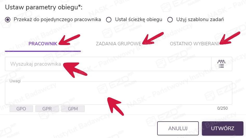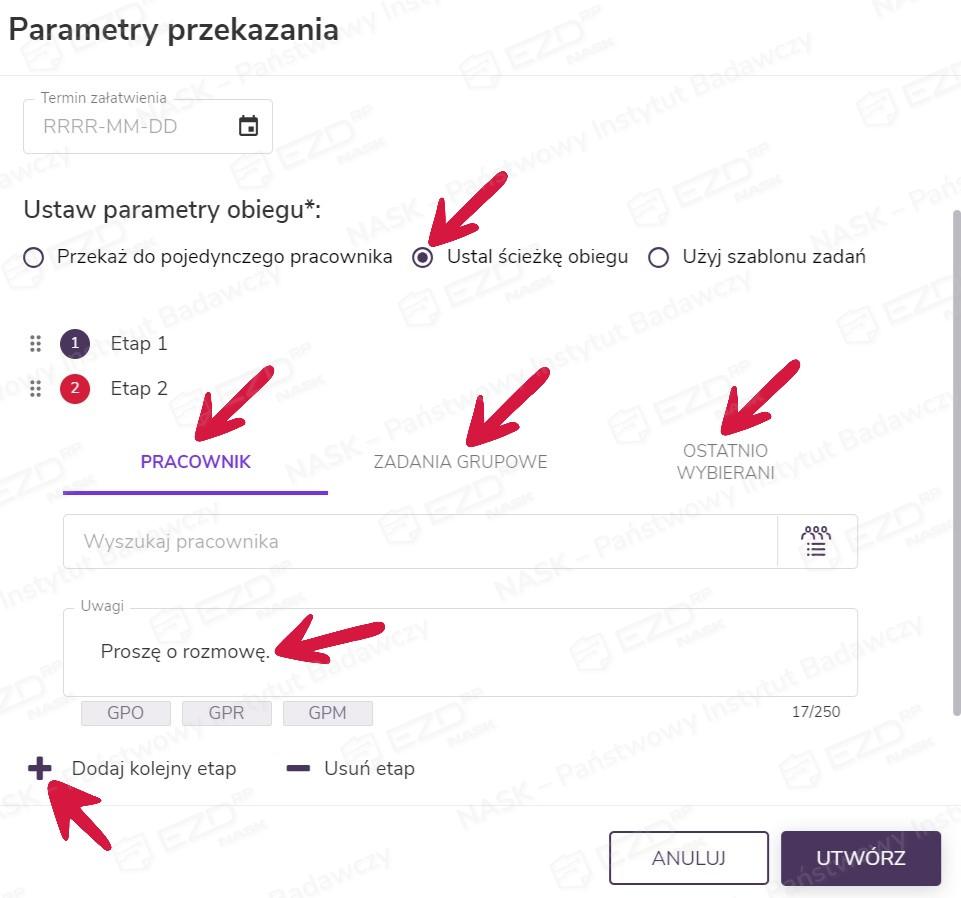 System umożliwia także przekazywanie w ramach ustalonej z góry ścieżki obiegu. Jest to możliwe po zdefiniowaniu z góry obiegu dokumentu. Po wybraniu opcji Ustal ścieżkę obiegu należy wskazać pracowników, którzy kolejno będą przekazywać i otrzymywać dokument na poszczególnych etapach. Wyboru pracowników na każdym z etapów można dokonać w jednej z trzech zakładek: Pracownik (można wyszukać pracownika, wpisując fragment imienia lub nazwiska), Zadania grupowe (wystawianie i podejmowanie zadań grupowych) lub Ostatnio wybierani (niedawno wskazywani pracownicy). Dodanie kolejnych etapów ścieżki obiegu następuje poprzez kliknięcie przycisku z plusem Dodaj kolejny etap. Przy każdym z poszczególnych etapów dostępne jest osobne pole Uwagi, gdzie można umieścić treść dekretacji, wpisując odpowiednie polecenie, lub skorzystać z gotowych formuł przypisanych do przycisków znajdujących się pod polem.