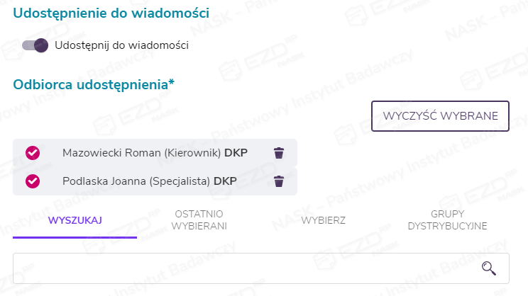 Użytkownik może wybrać odbiorców, wprowadzając ich imiona lub nazwiska w polu Wyszukaj, korzystając z podpowiedzi w zakładce Ostatnio wybierani lub wybrać osoby ze struktury organizacyjnej instytucji. Może również skorzystać ze zdefiniowanych grup dystrybucyjnych (zob. artykuł pt. Tworzenie i edycja grup dystrybucyjnych).