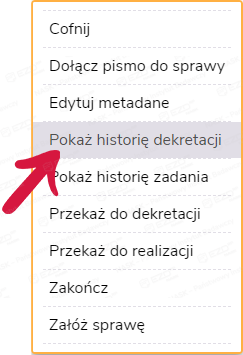 W szczegółach zadania, pod przyciskiem Akcje możliwe jest wybranie opcji Pokaż historię dekretacji.