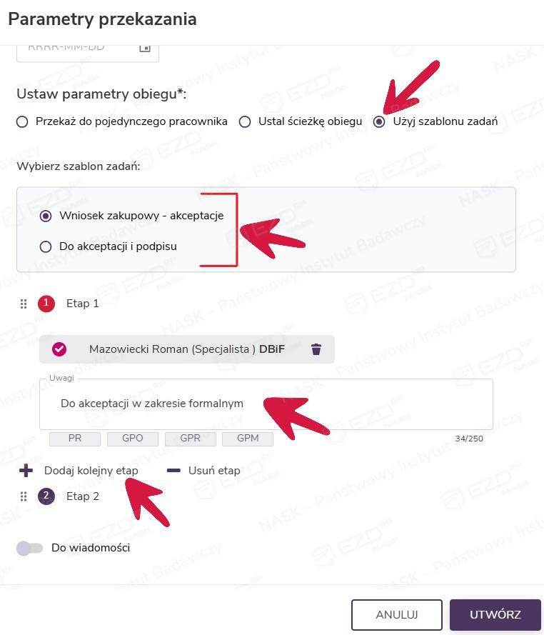 Ostatnią z opcji ustawienia parametrów obiegu jest szablon zadań. W tym celu należy wybrać opcję Użyj szablonu zadań. W widoku pojawią się dostępne szablony. Po dokonaniu wyboru szablonu wyświetlą się jego poszczególne etapy, które opcjonalnie można edytować, tzn. zmienić pracownika lub treść w polu Uwagi. Użytkownik może również dodać kolejne etapy poprzez wybranie przycisku Dodaj kolejny etap.