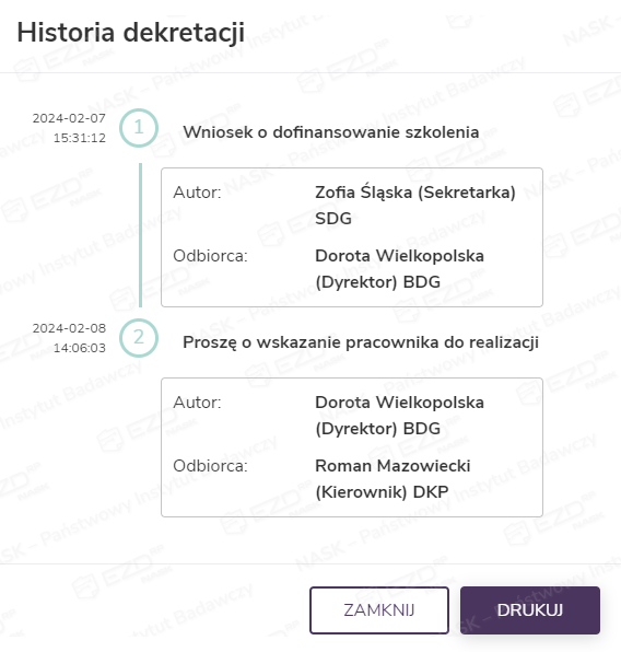 Dzięki niej pracownik może zapoznać się z drogą, którą pismo przebyło od momentu rejestracji w systemie. Może też wydrukować Historię dekretacji, żeby np. dołączyć ją do sprawy prowadzonej papierowo.