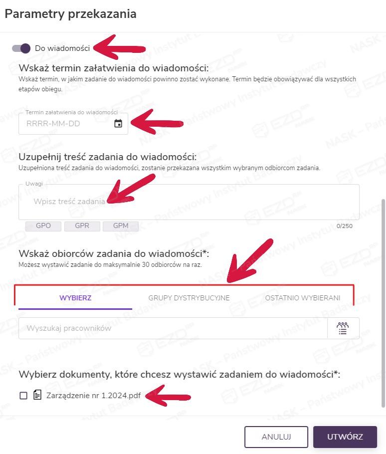 Dekretowane pismo można również jednocześnie przekazać do wiadomości innym pracownikom. W tym celu należy kliknąć suwak Do wiadomości (kliknięcie powoduje zmianę koloru i przesunięcie suwaka). W odsłoniętych polach użytkownik może wskazać termin załatwienia oraz uzupełnić treść zadania do wiadomości. Następnie należy określić odbiorców zadania do wiadomości poprzez wyszukanie ich za pomocą imienia i nazwiska, wskazanie odpowiedniej grupy dystrybucyjnej lub osób spośród ostatnio wybieranych pracowników. Na samym dole trzeba wybrać dokumenty, które zostaną wystawione zadaniem Do wiadomości.