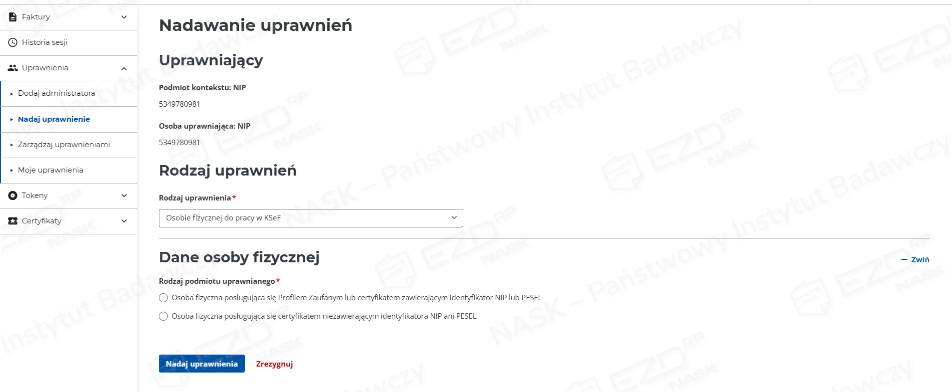 - uzupełnić Dane osoby fizycznej, której uprawnienie ma zostać przypisane.