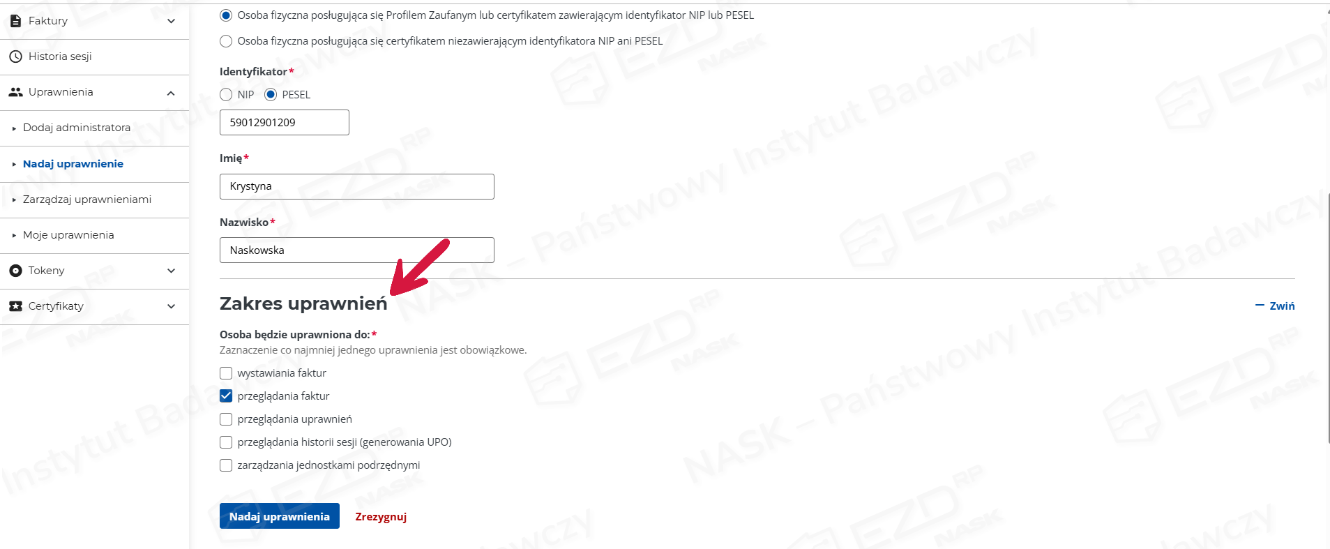 Następnie należy zaznaczyć Zakres uprawnień do przeglądania faktur.