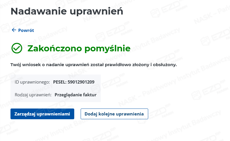 Po prawidłowym przypisaniu uprawnień system poinformuje nas o zakończeniu procesu.