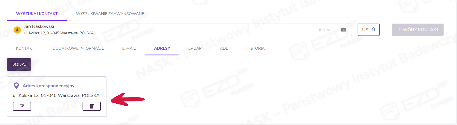 W systemie zostanie dodany adresat, co jest widoczne na poniższym zrzucie ekranu.