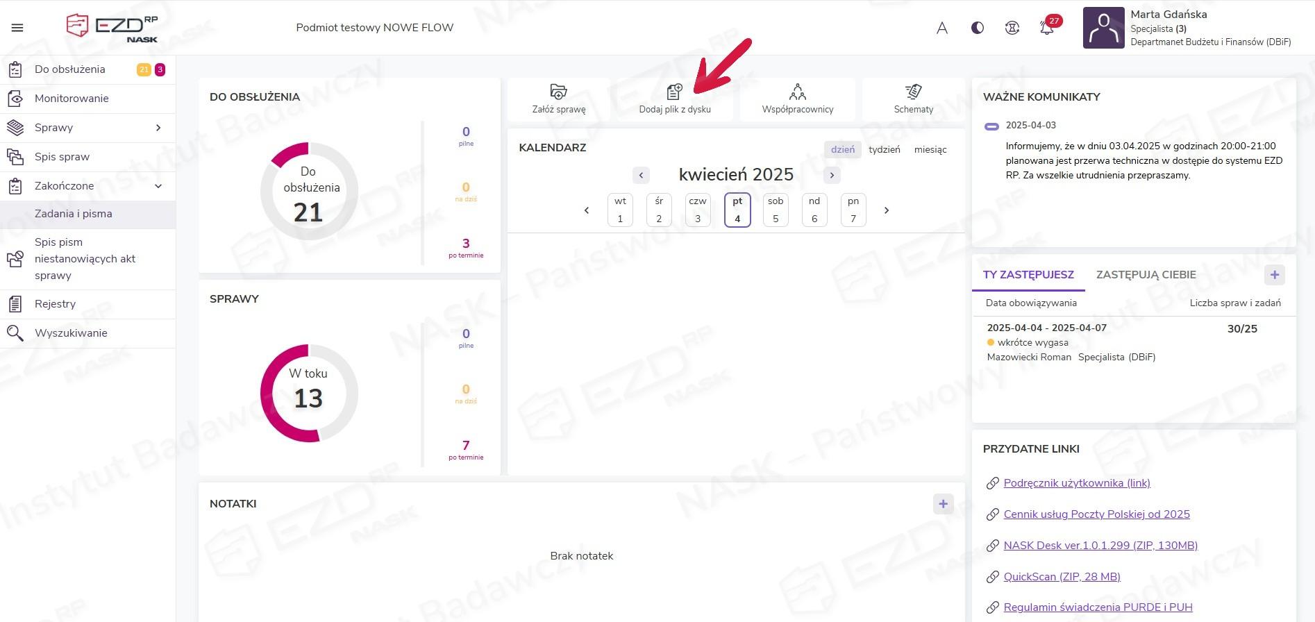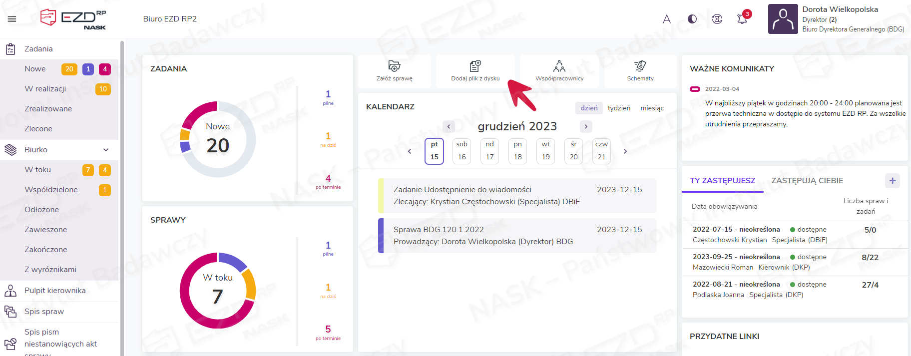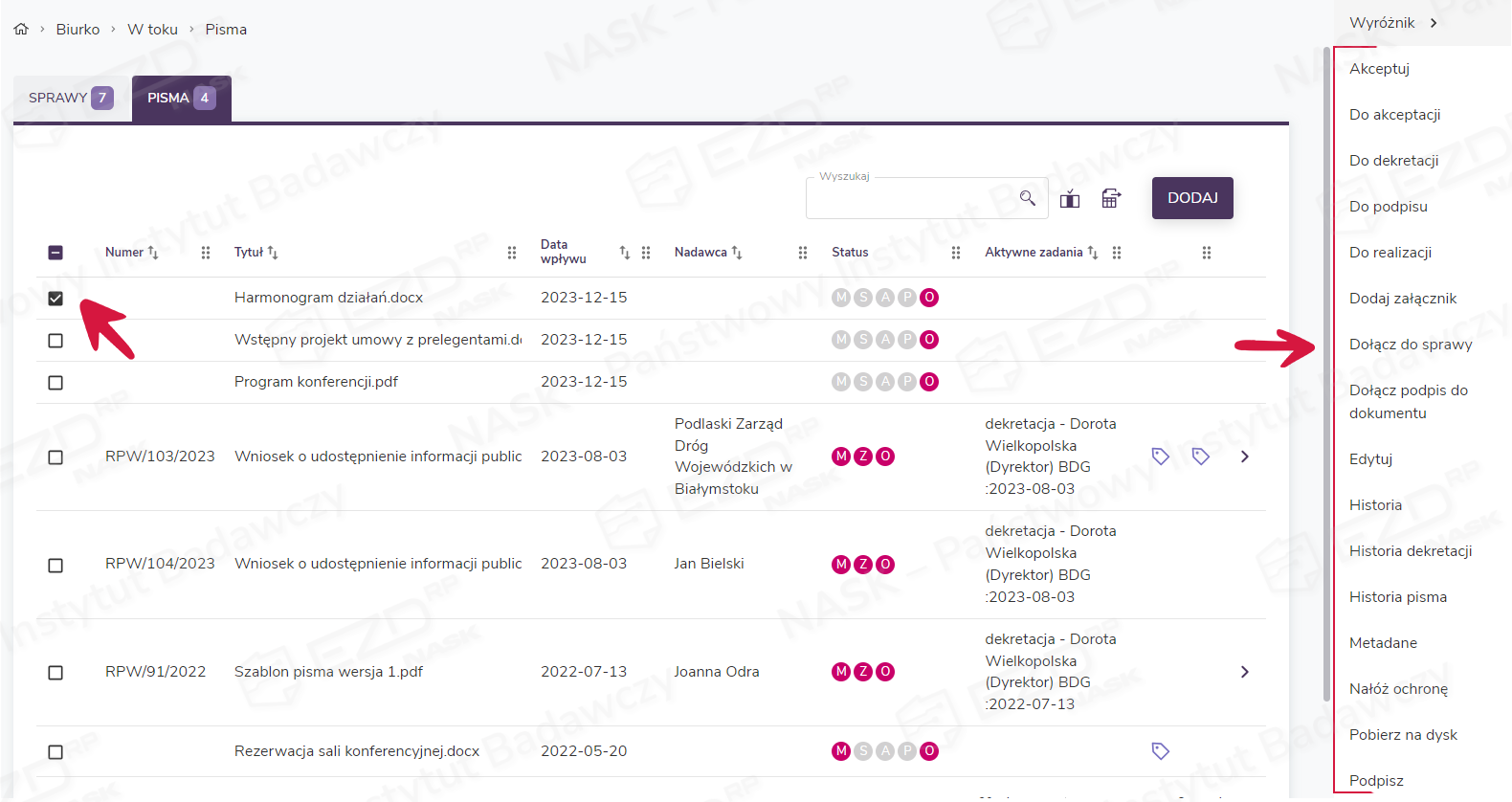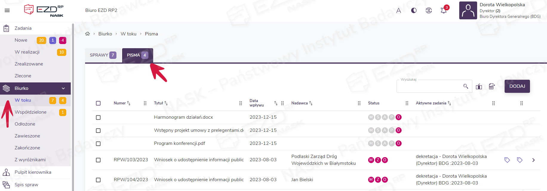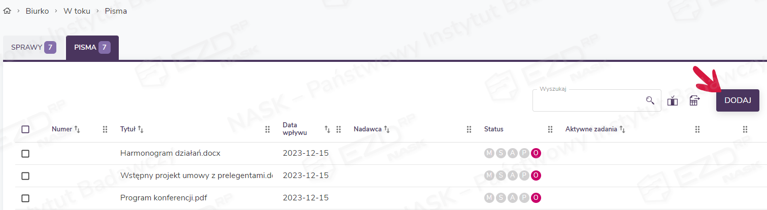 Dodany dokument (lub dokumenty) pojawi się w sekcji Biurko > W toku > Pisma.