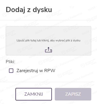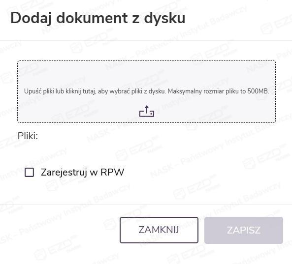 Po kliknięciu kafelka pojawia się panel boczny, w którym użytkownik może dodać dokument, wskazując zapisany na dysku plik lub stosując metodę „przeciągnij i upuść”. Aby dodać plik, należy kliknąć przycisk Zapisz. Wybranie przycisku Zamknij oznacza rezygnację z tej czynności.