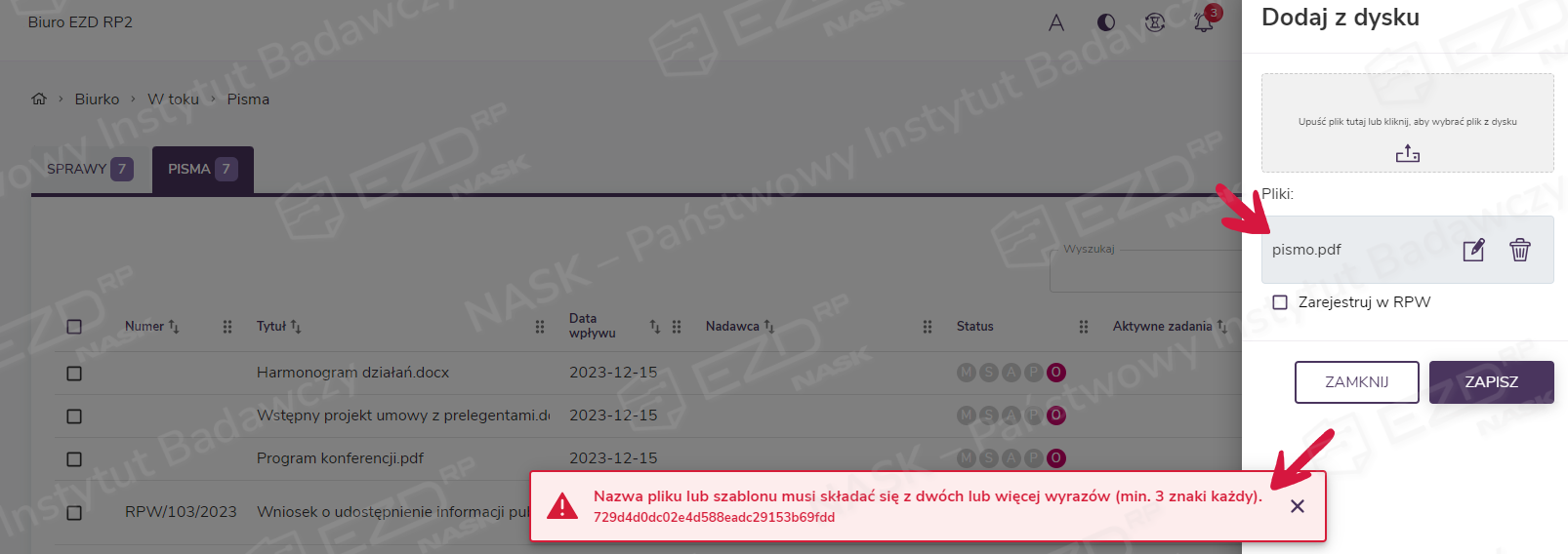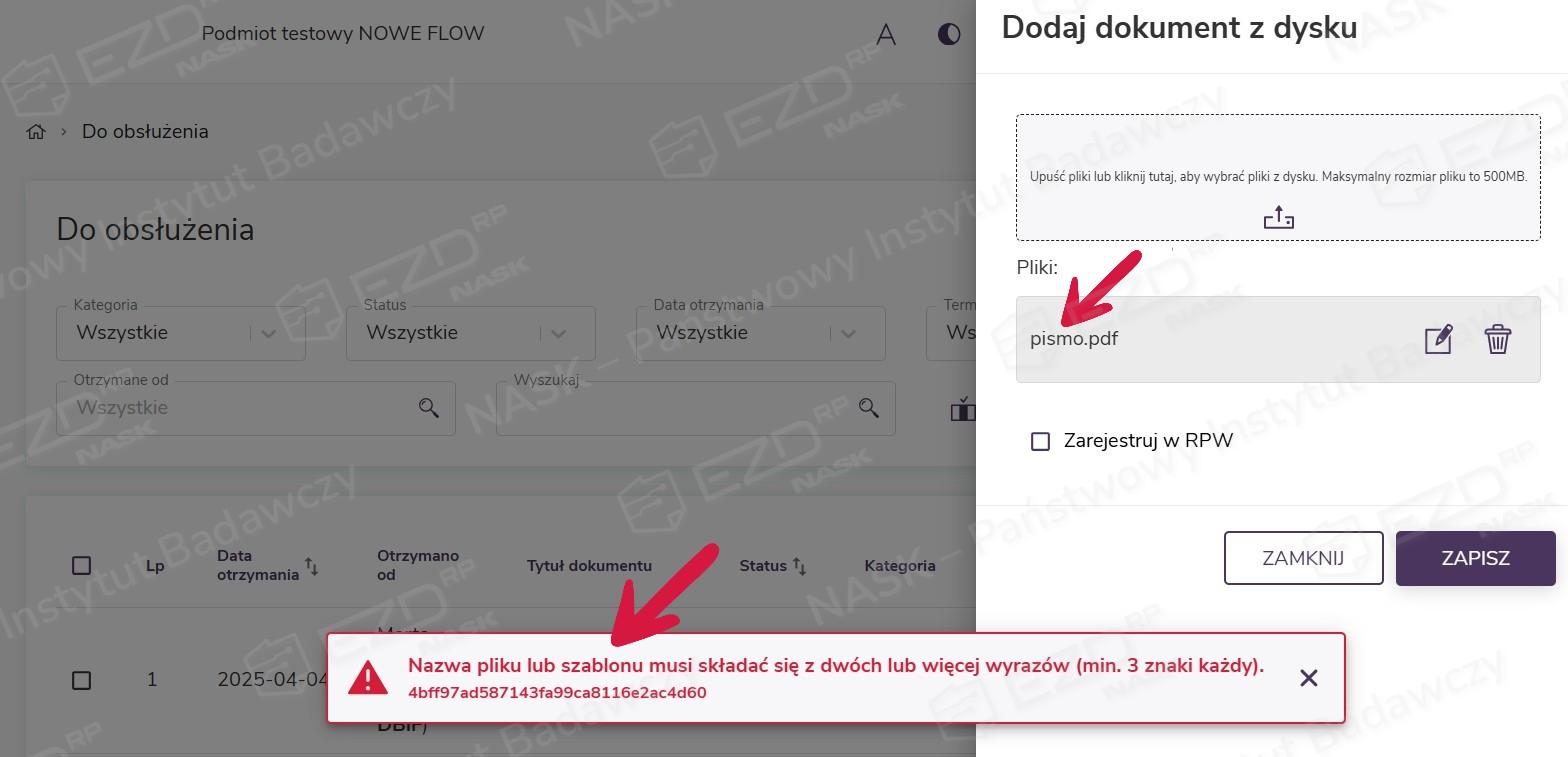 Zabezpieczenie to zapobiega dodawaniu plików o zbyt krótkich nazwach, które mogą utrudniać wykonywanie powierzonych zadań, wprowadzać w błąd lub są niezrozumiałe. W momencie dodawania niespełniającego wymagań pisma system wyświetla komunikat o potrzebie zmiany tytułu.