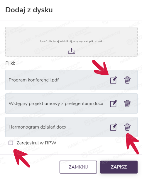 W oknie dodawania można – korzystając z ikony notesu – zmienić nazwę pliku bądź zrezygnować z jego wgrania (ikona kosza).
