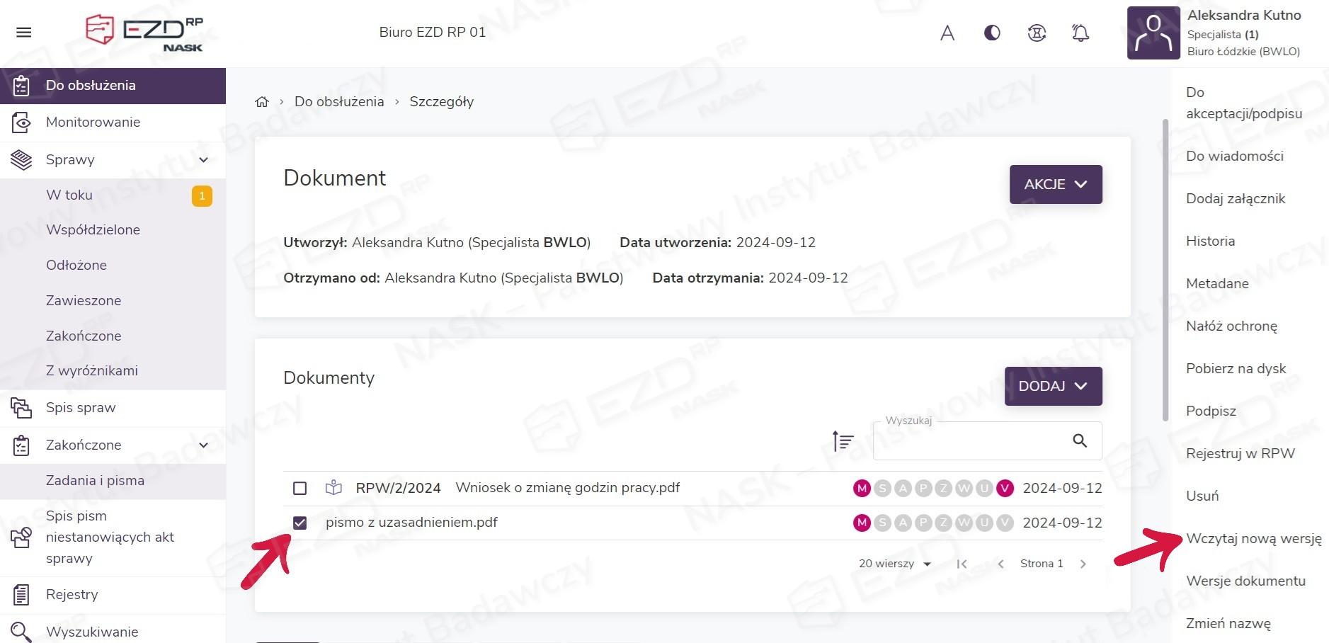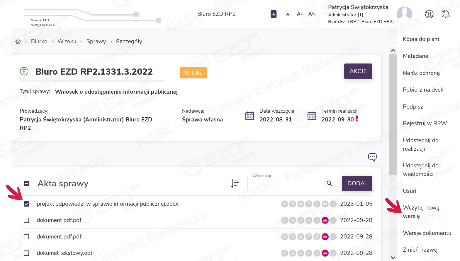 Po wczytaniu nowej wersji zmieni się nazwa dokumentu, jeżeli wczytywana wersja będzie miała nadaną inną nazwę niż dokument w systemie EZD RP. Zmieni się też kolejność wyświetlania dokumentu w aktach sprawy oraz data dokumentu widoczna na liście dokumentów w sprawie.
