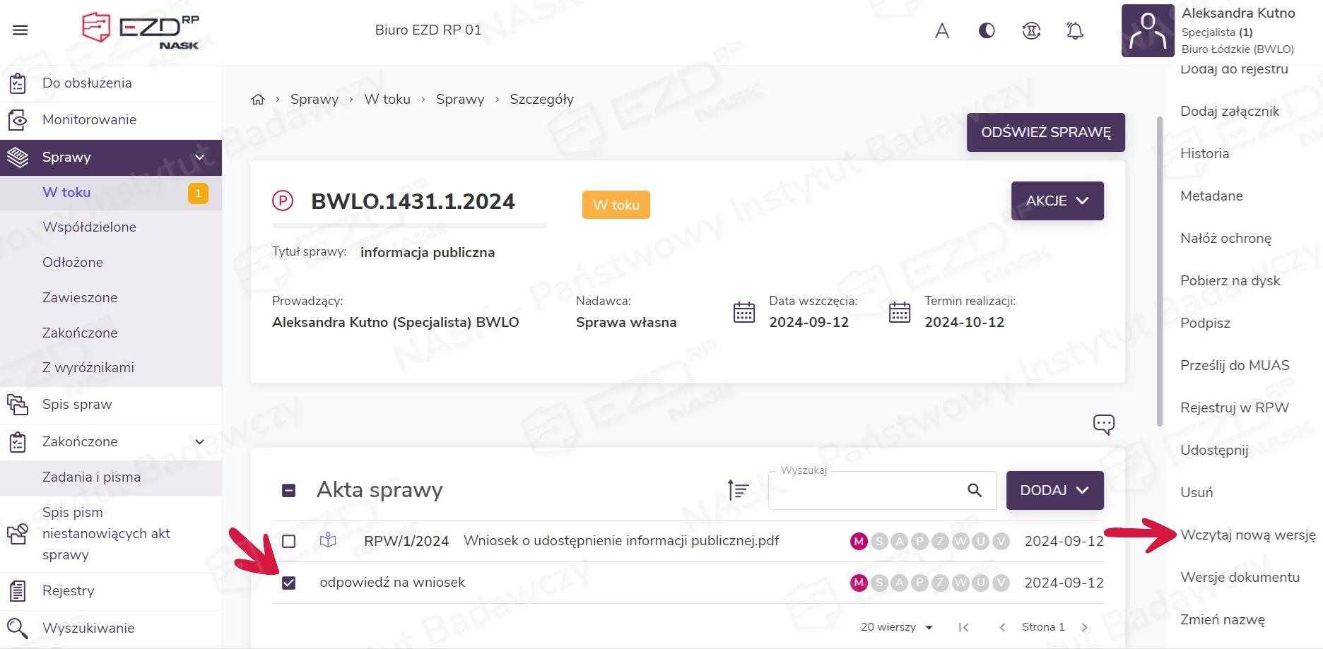 Po przygotowaniu projektu pisma poza EZD RP należy powtórnie dodać go do systemu – nie w postaci nowego dokumentu, ale jako kolejną wersję pliku, który już znajduje się w aktach sprawy. W tym celu trzeba zaznaczyć pole wyboru przy dokumencie w sekcji Akta sprawy, a następnie w menu kontekstowym po prawej stronie ekranu kliknąć opcję Wczytaj nową wersję.