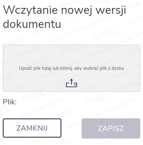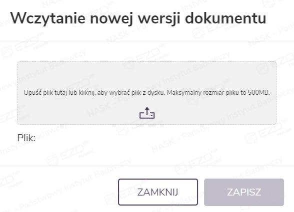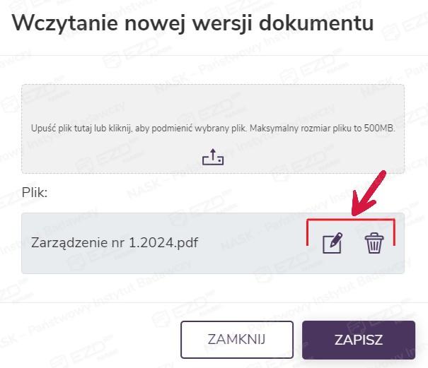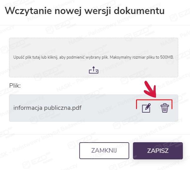 Po wczytaniu pliku można zmienić jego nazwę (przy pomocy ikony z długopisem) lub go usunąć (ikona kosza). Wybór należy zatwierdzić przyciskiem Zapisz.