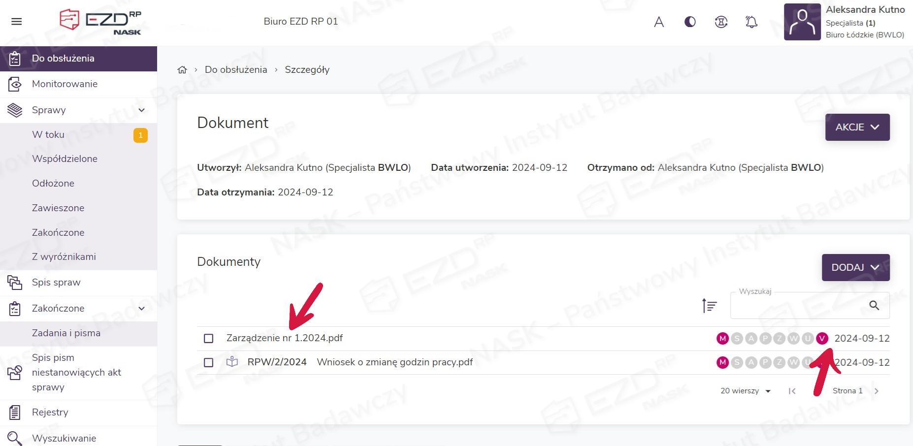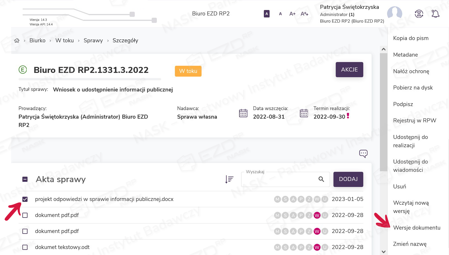 Edycja dokumentu, wczytanie jego nowej wersji z dysku lub podpisanie powoduje pojawienie się nowej wersji w systemie EZD RP, a także zmianę daty i kolejności wyświetlania w aktach sprawy. Akceptacja lub odrzucenie dokumentu oraz edycja metadanych nie powodują zmiany wersji ani kolejności wyświetlania dokumentu w aktach sprawy, a jedynie zmianę daty widocznej przy dokumencie.