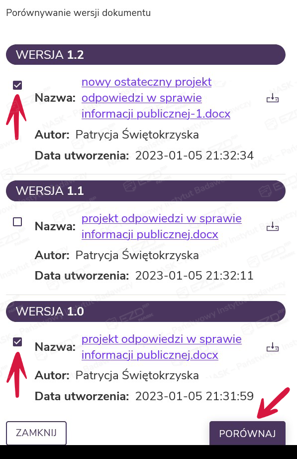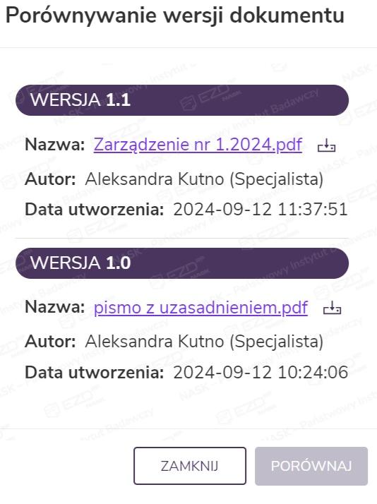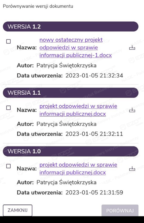Istnieje również możliwość porównania ze sobą dwóch wersji dokumentu. Funkcja korzysta z narzędzi porównywania dostępnych w edytorze tekstu Word, dlatego dostępna jest tylko dla plików w tym formacie. Należy zaznaczyć pola wyboru przy wersjach, które mają być porównane, a następnie kliknąć przycisk Porównaj na dole listy. Wybrane pliki wyświetlą się w edytorze tekstu.