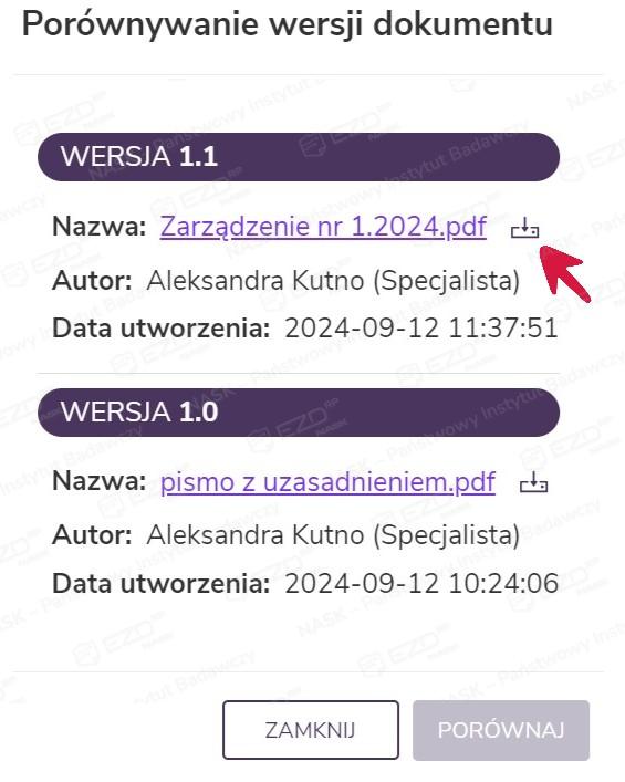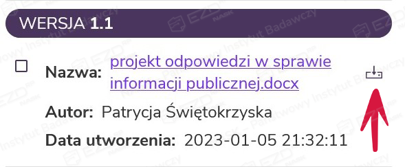 Po prawej stronie nazwy znajduje się ikona pobierania wersji dokumentu. Za jej pomocą możemy pobrać na dysk wybraną wersję.