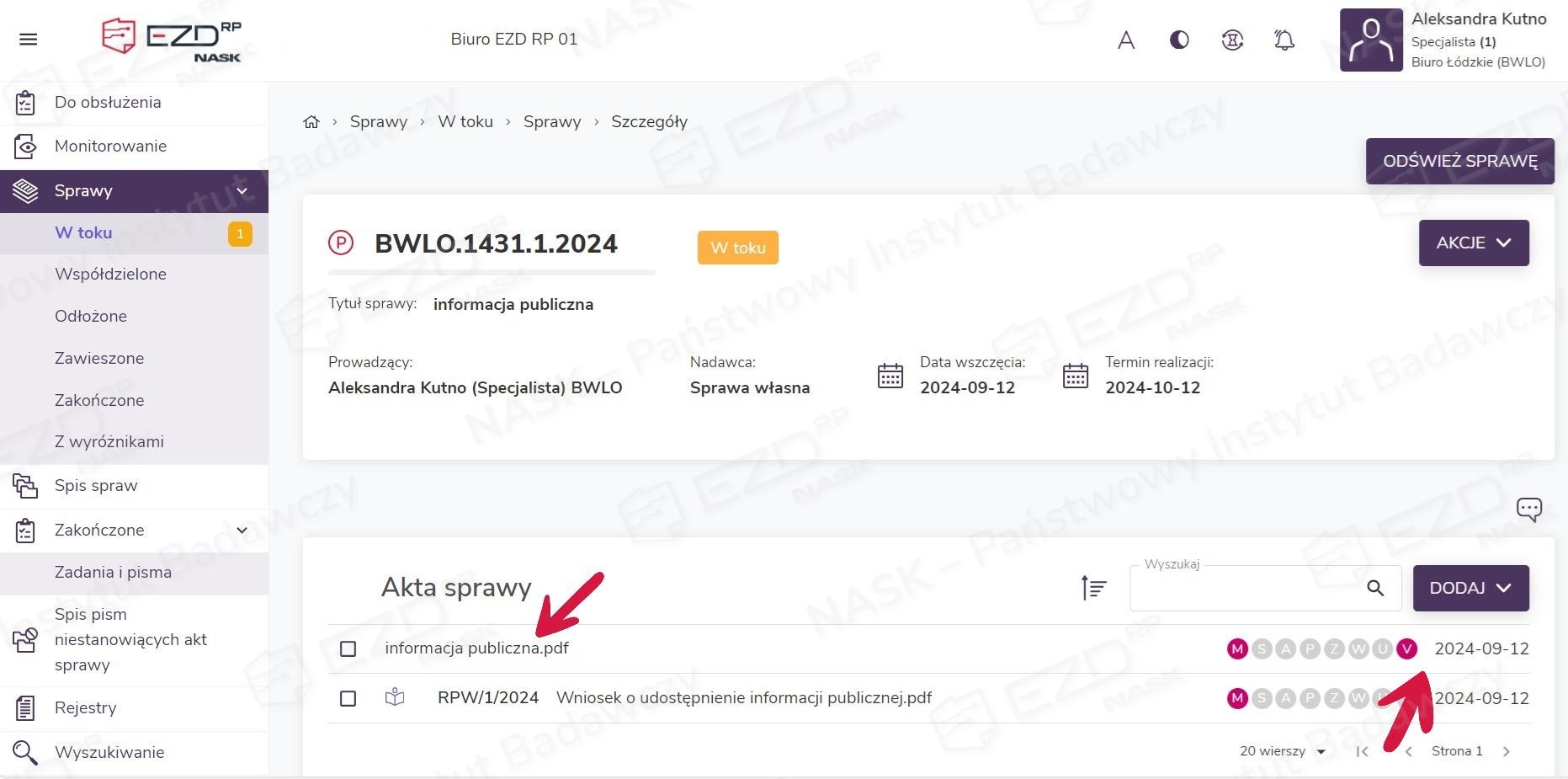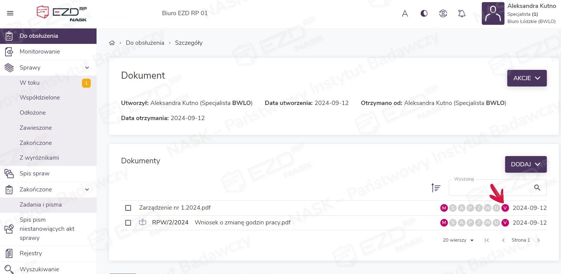 Jeżeli wczytywany plik miał inny tytuł niż ten znajdujący się już w EZD, po wczytaniu nowej wersji nazwa dokumentu zmieni się. Ponadto w związku z pojawieniem się nowej wersji ikona statusu V zabarwi się, zmieni się też miejsce wyświetlania dokumentu w aktach sprawy oraz zaktualizuje się jego data widoczna na liście.