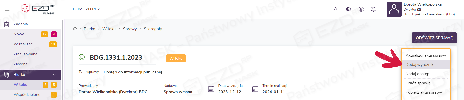 W celu dodania wyróżnika do sprawy należy, będąc wewnątrz sprawy, kliknąć przycisk Akcje i wybrać opcję Dodaj wyróżnik.