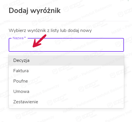System wyświetla z prawej strony panel boczny, w którym możliwe jest wybranie wyróżnika z rozwijanej listy lub dodanie własnego. Wprowadzone wcześniej wyróżniki wyświetlają się po kliknięciu pola Nazwa.