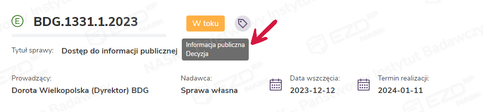 Po wybraniu lub dodaniu wyróżnika i kliknięciu przycisku Zapisz jego symbol pojawi się przy wskazanym dokumencie. Po najechaniu kursorem na ikonę wyświetli się nazwa wyróżnika.