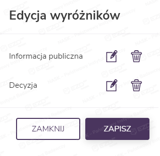Kliknięcie ikony wyróżnika daje możliwość jego edycji lub usunięcia.