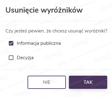 Po zaznaczeniu pola wyboru przy konkretnym obiekcie w prawym menu dostępna jest opcja usunięcia z niego wyróżnika. W przypadku dokumentów i pism dodatkowo możliwe jest pobranie ich na dysk komputera.