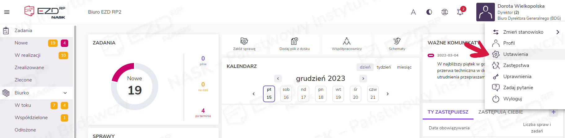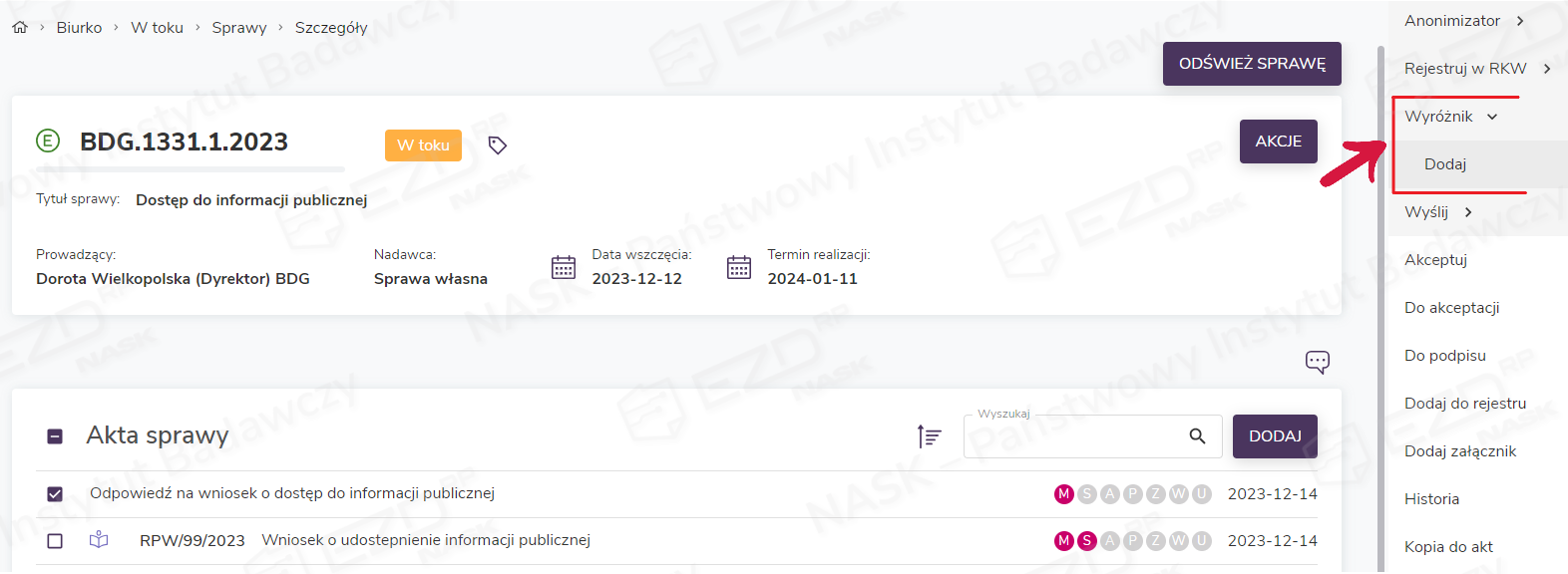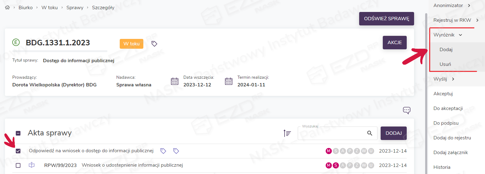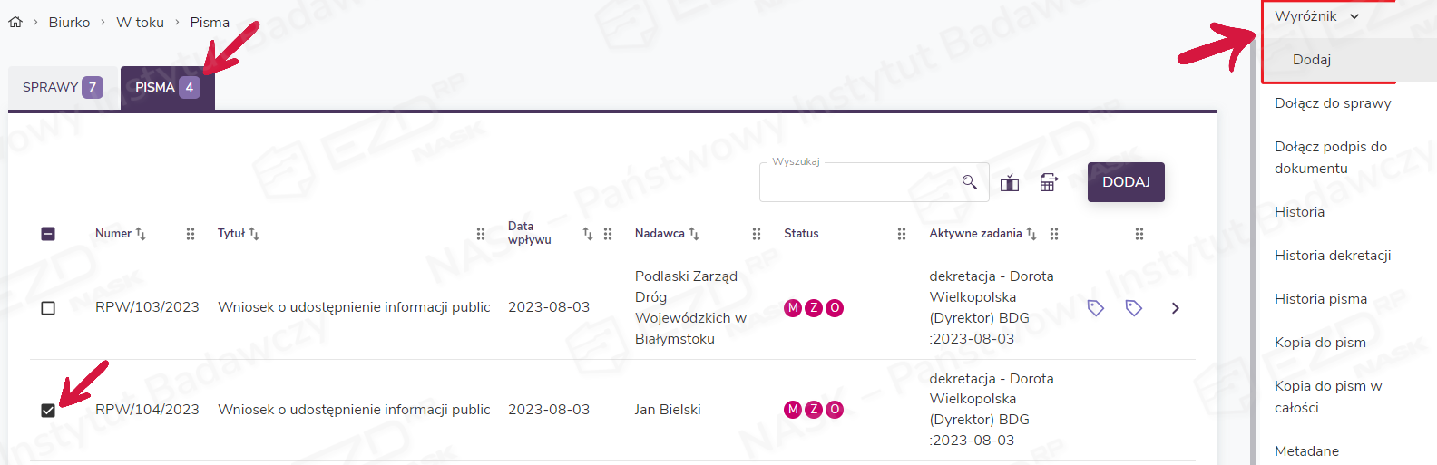 Podobnie jak sprawy i dokumenty również pisma (Biurko > W toku) można oznaczać wyróżnikami. W tym celu zaznaczamy pole wyboru przy danym piśmie i z prawego menu wybieramy opcję Wyróżnik > Dodaj.