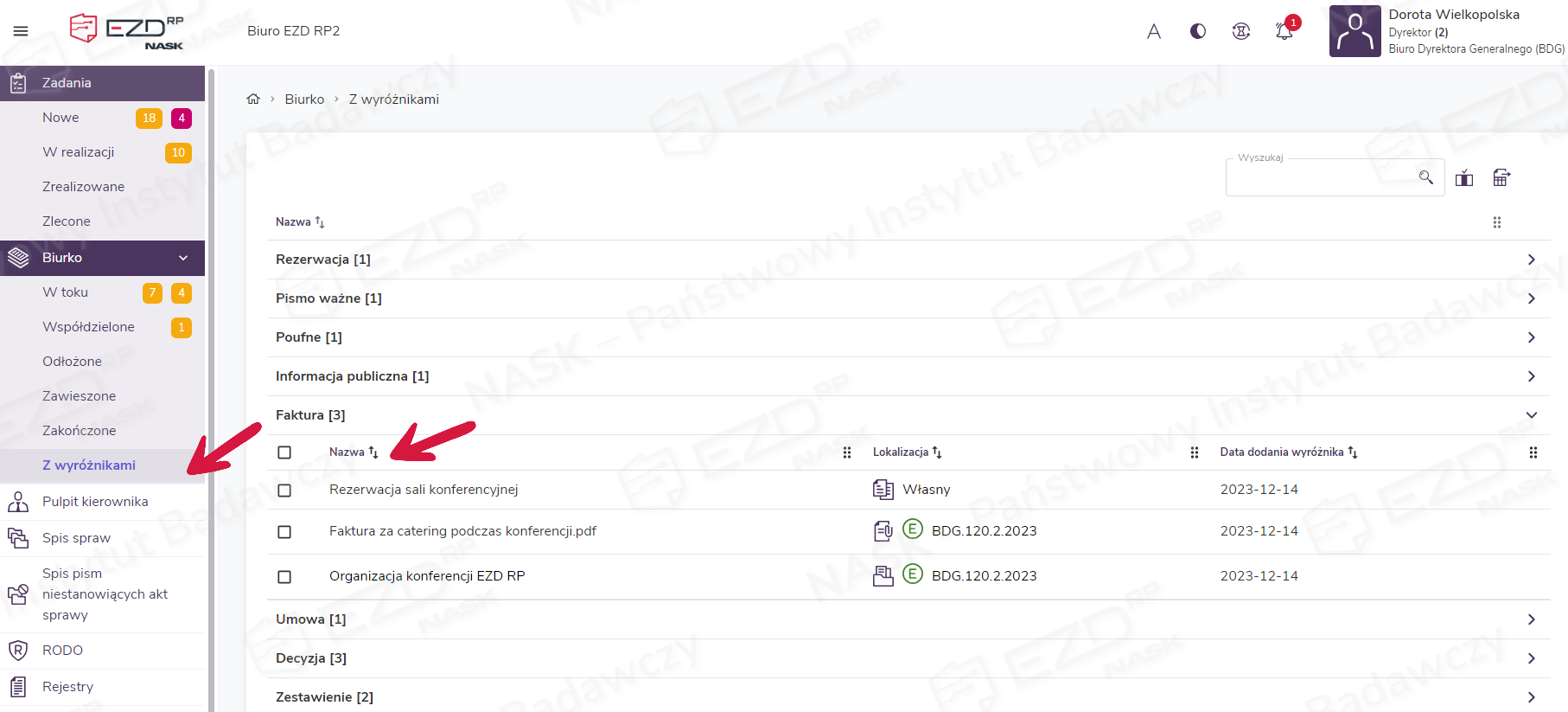 Zestawienie wszystkich wyróżników przypisanych do dokumentów, pism oraz spraw znajduje się w widoku Biurko > Z wyróżnikami. To, jakie obiekty zostały oznaczone konkretnym wyróżnikiem, można zobaczyć po rozwinięciu wiersza z jego nazwą.