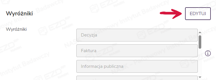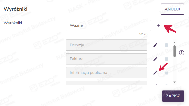 Wybranie przycisku Edytuj daje możliwość wpisania nazwy nowego wyróżnika. Po zatwierdzeniu symbolem plusa zostanie ona dodana do listy. Możliwe jest również poprawienie (po kliknięciu ikony długopisu) lub usunięcie (ikona kosza) wyróżników już utworzonych.