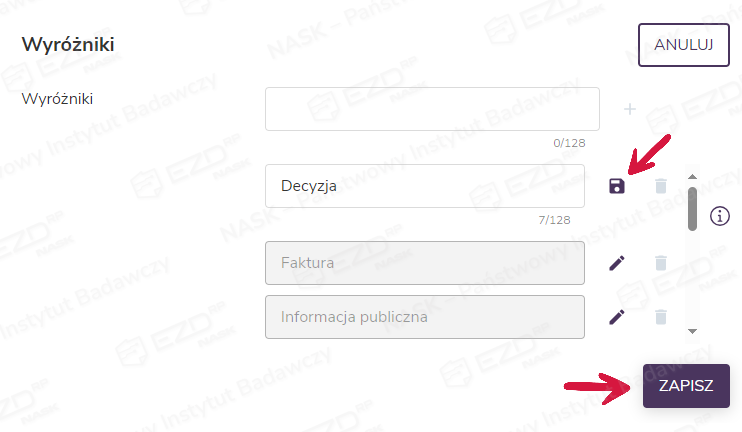 Zmiany w nazwie wyróżnika (np. po poprawieniu literówek) należy zatwierdzić poprzez kliknięcie ikony dyskietki, a następnie przycisku Zapisz.