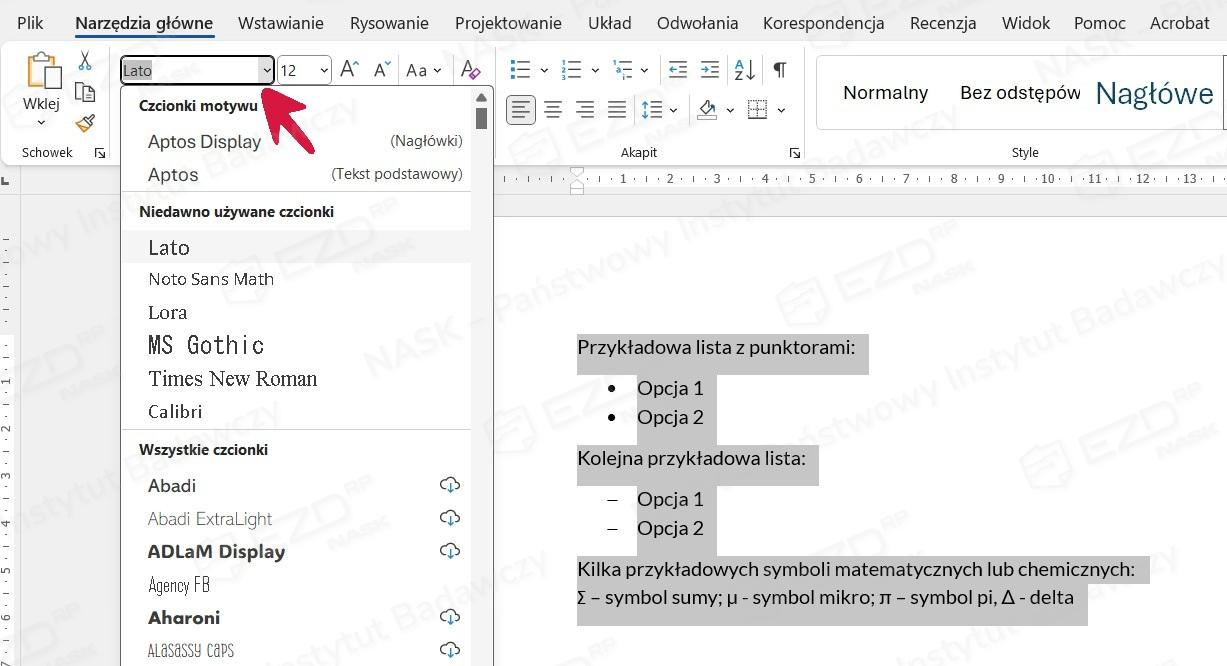 Po zaznaczeniu całej treści dokumentu, a następnie wybraniu, np. czcionki Lato, program do edycji tekstu zamieni czcionkę dla całego tekstu. Wyjątkiem są symbole, znaki matematyczne, fizyczne lub chemiczne oraz punktory.