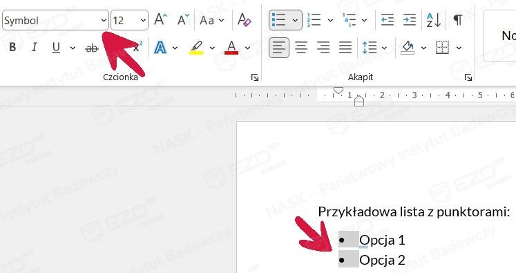 By zmienić domyślną czcionkę dla punktorów, należy wybrać Symbol.