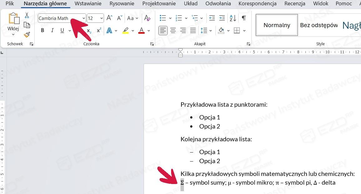 Tworzenie i edycja dokumentów w programach biurowych z użyciem czcionek stosowanych w systemie EZD RP może wymagać dodatkowego dostosowania dla punktorów, znaków matematycznych, symboli fizycznych lub chemicznych.