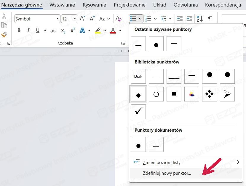 Dla listy wypunktowanej należy zdefiniować nowy punktor. Trzeba zaznaczyć dany punktor przy liście i z górnego menu wybrać Punktory, a następnie opcję Zdefiniuj nowy punktor.