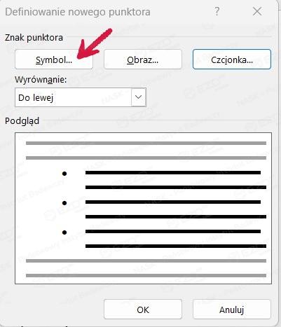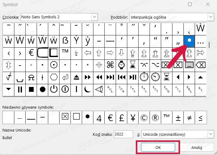 Po wyborze czcionki, kolejnym krokiem jest wybranie opcji Symbol. Z menu dostępnych znaków wybieramy odpowiedni symbol dla interesującego nas punktora. Wybór należy zatwierdzić przyciskiem OK, a potem znów OK.