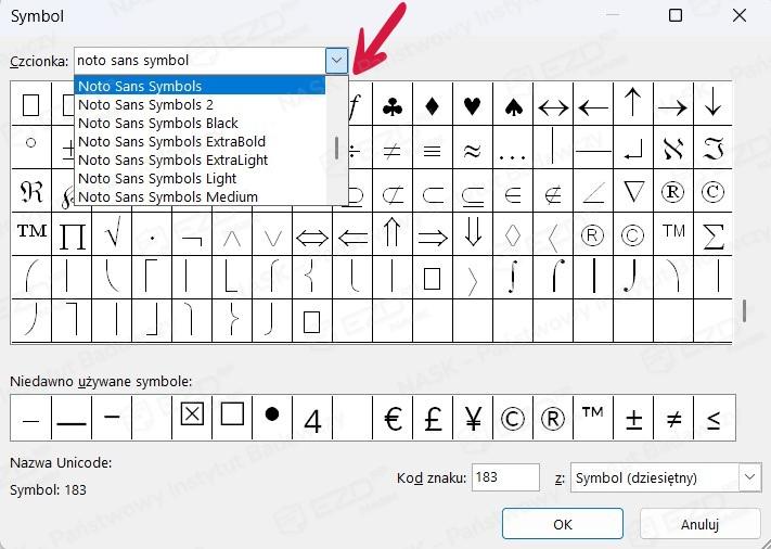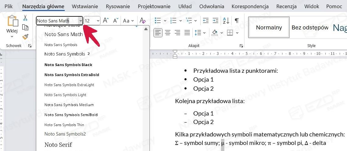 W menu wyboru czcionki należy odnaleźć interesującą nas czcionkę. Dla punktorów zalecana jest Noto Sans Symbols lub Noto Sans Symbols 2.